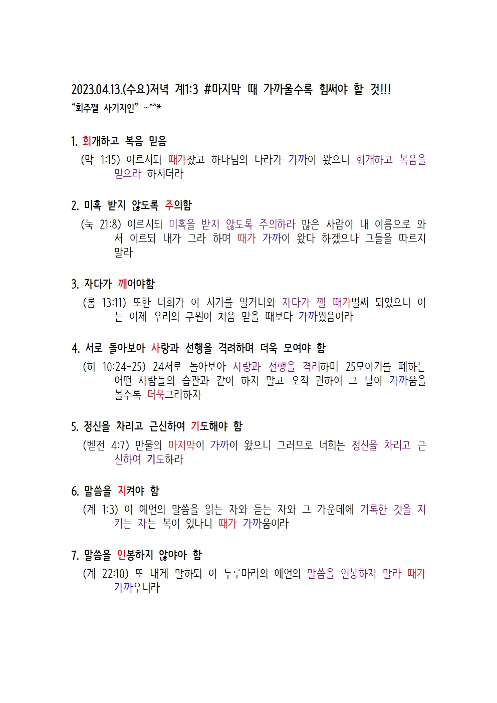#마지막 때 가까울수록 힘써야 할 것!!! 2023.04.13.(수요)저녁 계1:3